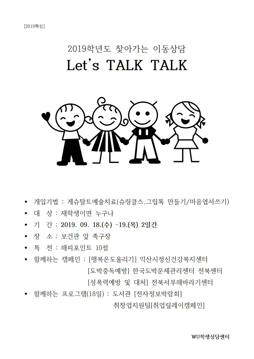 fnctId=bbs,fnctNo=286 [혁신]2019학년도 찾아가는 이동상담 참여 안내 글번호 96919 작성일 2019.09.17 수정일 2019.09.17 작성자 학생상담센터 조회수 1474 첨부파일 첨부파일이(가) 없습니다.